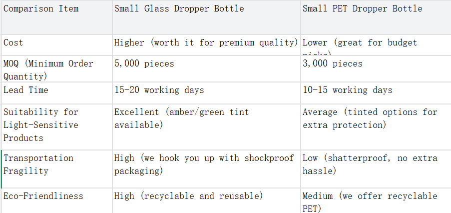 To sum up briefly: If your product is of high-end quality and requires light-blocking properties, and is mainly sold in the European and American markets, then a glass dropper bottle with small droplets would be the best choice; if you want a higher cost performance and are willing to handle it frequently, a PET plastic dropper bottle is suitable for storing daily items or small samples.
